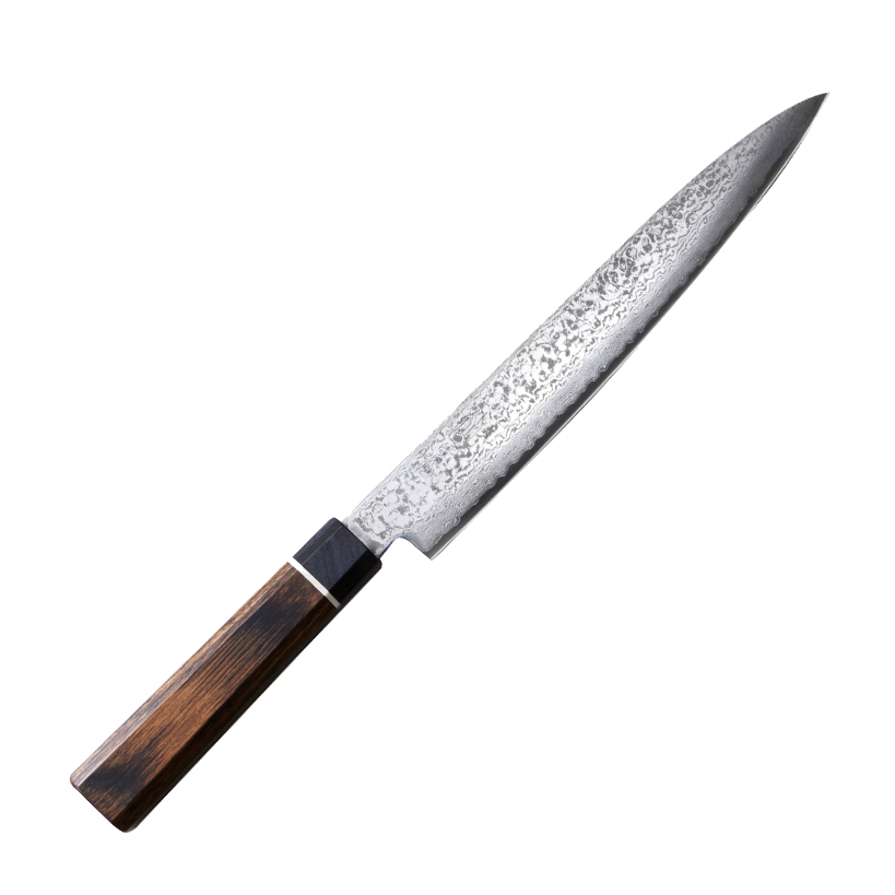 ダマスカス鋼は、コバルトが添加された特殊ステンレス刃物鋼であるVG10(V金10号)を芯材としています。VG10は、硬度や耐摩耗性を向上させた特殊なステンレスで、切れ味の良さと切れ味の持続性を引き出します。