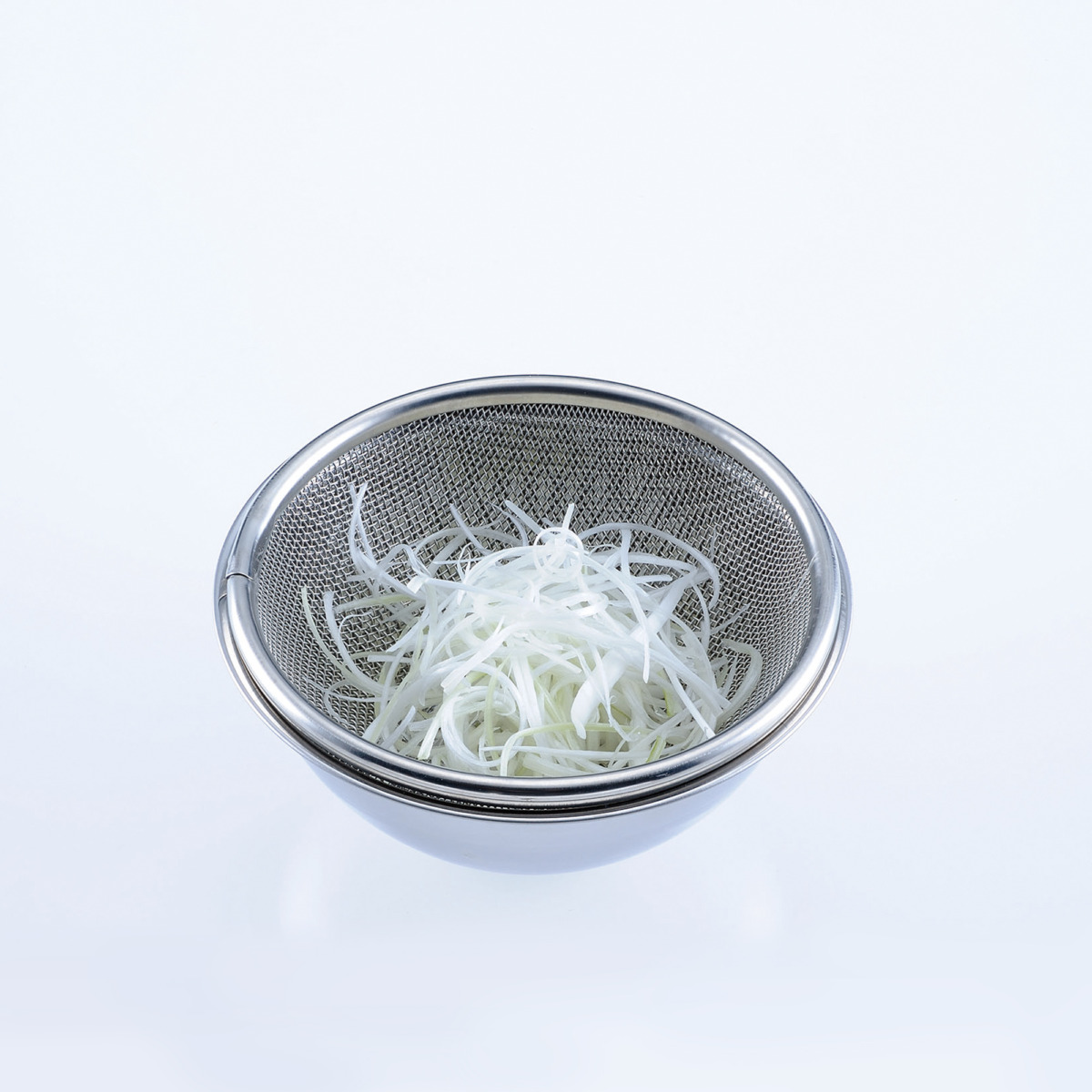 錆に強く、耐食性の高いステンレススチール製。通常より太めの線を使い、細かな網目(16メッシュ)に仕上げています。脚部分は金網だけのシンプルな構造なので清潔に使用できます。日本の細やかで優れた技術と品質から生まれたストレスフリーなザルです。