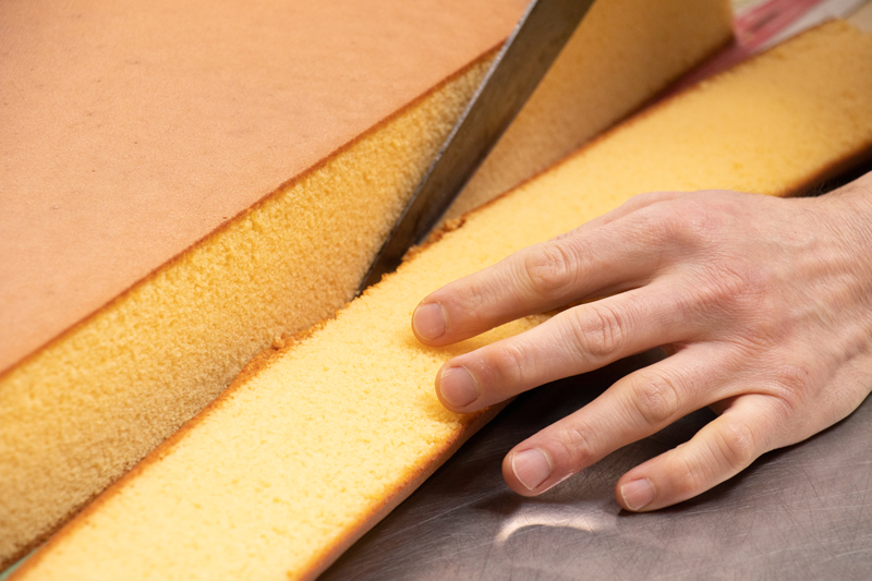 また、縦400×横600mmの業務用天板で焼いたケーキも、縦方向にナイフを一刀入れるだけで切り分けられる優れもの。刃を入れ直さないため断面が美しく、口溶け良く仕上がるのはもちろん、作業時間も大幅にカットします。