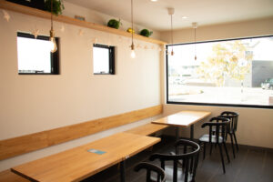 お店へのアプローチは広々とし、明るく爽やかな外観が印象的なパティスリー。店内には広めのイートインスペースも完備されていて、カフェ利用で訪れる方も多いお店です。