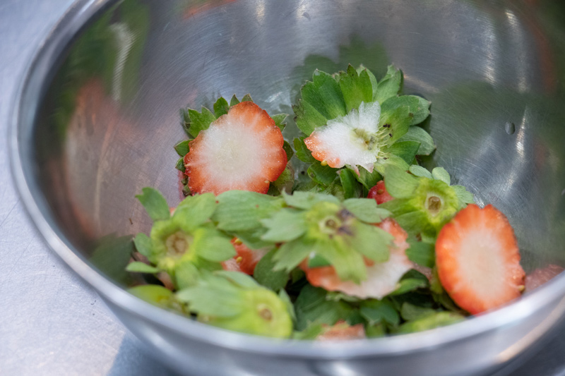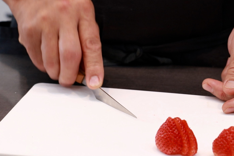 流れるような動作で次々といちごのヘタを取り、スライスしていく遠藤シェフ。
