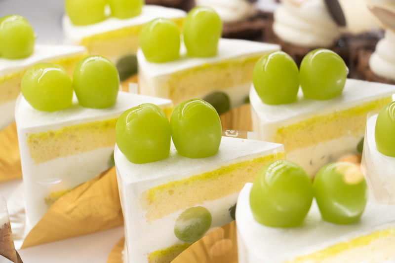 糖度が高くジューシーなシャインマスカットは、いちごの季節が終わった頃からショートケーキに仕立てられることの多いフルーツ。暑さが残る季節に、グリーンの爽やかな色と香りと甘さが人気のフルーツです。